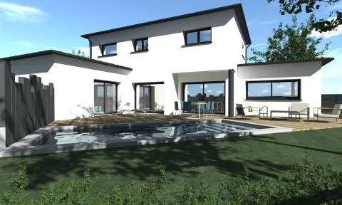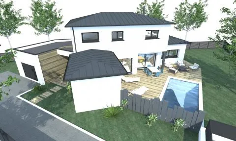 Cette future réalisation d'une superficie de 150 m² avec toiture zinc 4 versants pour la maison principale et excroissance toit plat pour le garage, sera construite sur un étage. L'entrée sera couverte d'un bardage bois, ce qui apporte à la maison, un côté naturel et chaleureux.