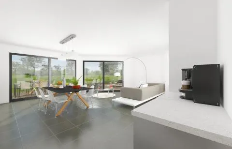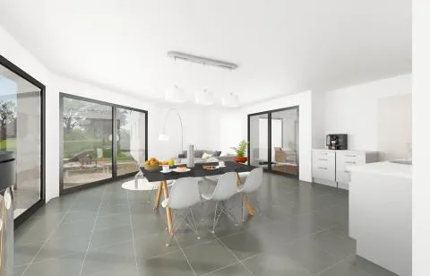 Le salon, séjour et la cuisine seront une seule et unique pièce dans la mesure où la cuisine, comme souvent pour prioriser le partage et la convivialité à la maison, sera ouverte sur la pièce de vie. Avec un accès sur la terrasse extérieure et une vue sur le jardin, le salon sera particulièrement clair et lumineux.