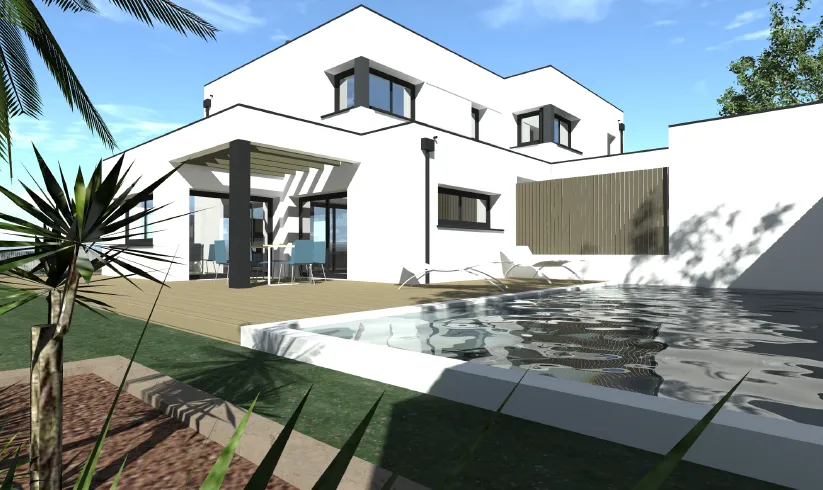 Avec sa toiture monopente, cette réalisation moderne et contemporaine disposera d'une grande terrasse extérieure donnant sur le salon et lui apportant, de fait, une parfaite luminosité.