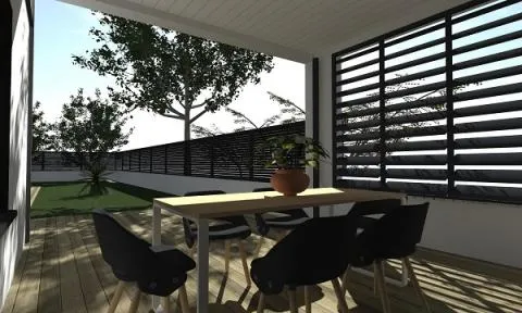 À l'extérieur de la maison, une piscine sera construite, ainsi qu'une grande terrasse extérieure pour profiter du soleil aux beaux jours, et un espace couvert. Les matériaux utilisés, parement pierre et bardage bois du Canada, apportent une touche naturelle.
