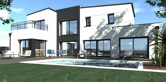 Nos clients ont choisi une maison individuelle avec piscine pour profiter des beaux jours en Ille-et-Vilaine ! Construite sur la longueur, cette future maison contemporaine de 160 m² bénéficiera d'une exposition Ouest qui lui apportera beaucoup de luminosité. Sur un étage, elle comportera 2 chambres, dont une chambre parentale, ainsi qu'un bureau avec accès terrasse extérieure, qui peut également faire office de chambre, si besoin. Dans la maison se trouvera également un vide sur séjour, une double hauteur séjour pour faire davantage entrer la clarté à l'intérieur du logement. Cerise sur le gâteau, un ensemble de baies vitrées sera installé sur toute la longueur de cette maison contemporaine.